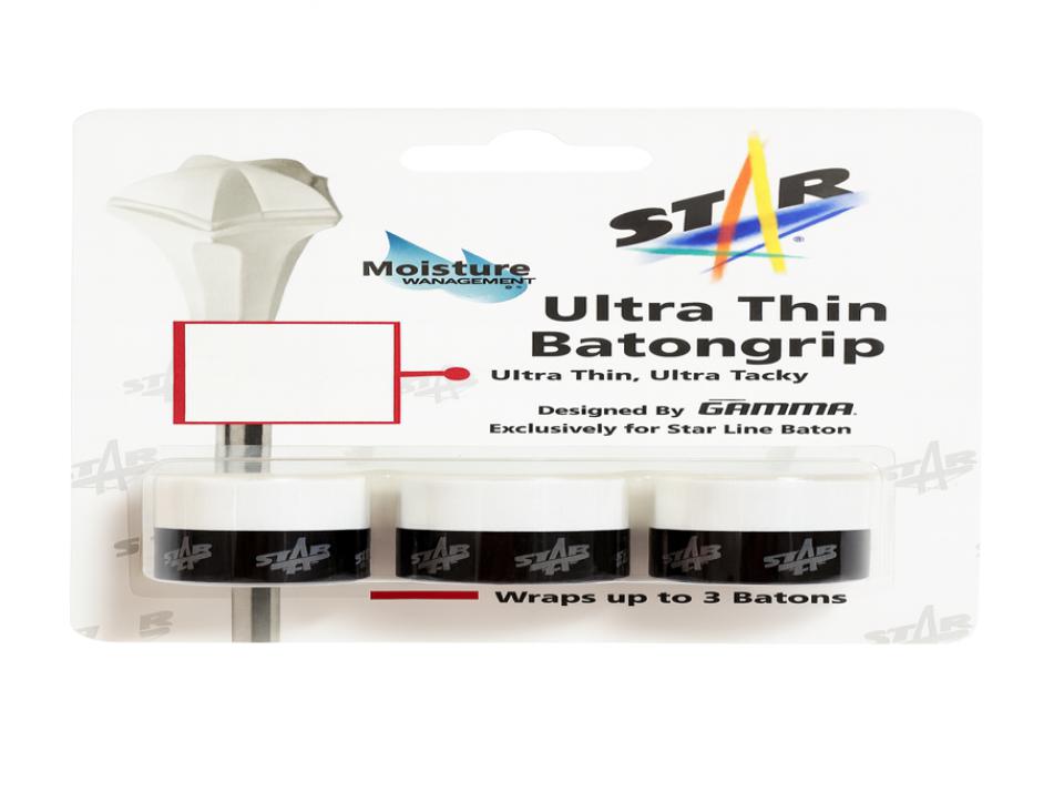Star Line's Ultra Thin Batongrip offers excellent tackiness and absorbency! Its soft feel won't rub or cause blisters, yet it is durable enough to stand up to many hours of practice. A strip of finishing tape is included for each roll so it won't come loose or unravel during fierce competition. 3 grip Pack Length: 1250 mm x Width 27 mm